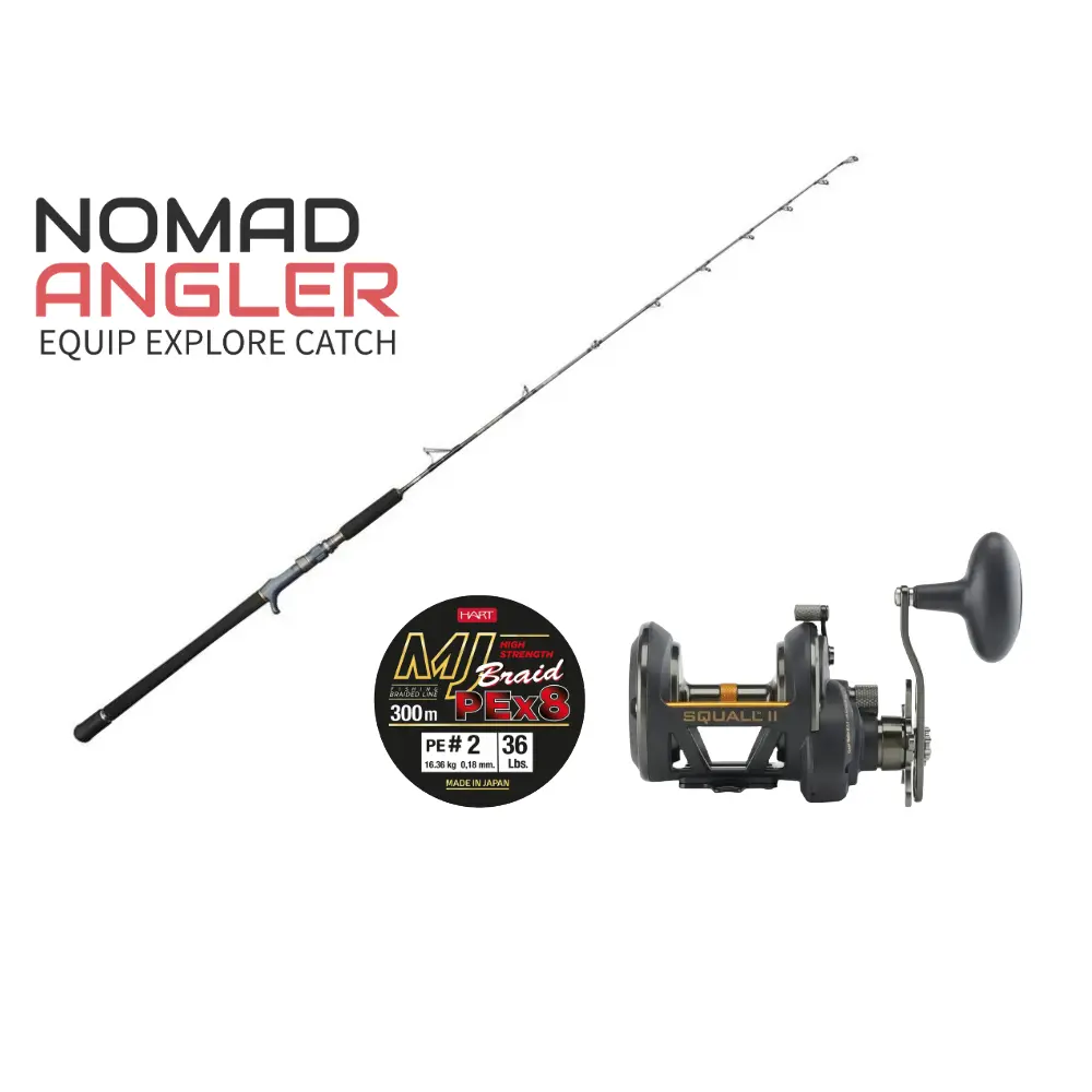 Verhuur van een krachtige hengelset voor zware visserij: PENN Battalion Jigging (500g) en PENN Squall II Star Drag 25 (LH), opgespoeld met 500m Hart MJ Braid 0.25/100 met een trekkracht van 23,64 kg. Geschikt voor diep en zwaar vissen op heilbot, kabeljauw, leng en lom. Nieuwprijs ca. €390 – nu te huur vanaf €80. Ophalen bij Nomad Angler in Zonnegem.